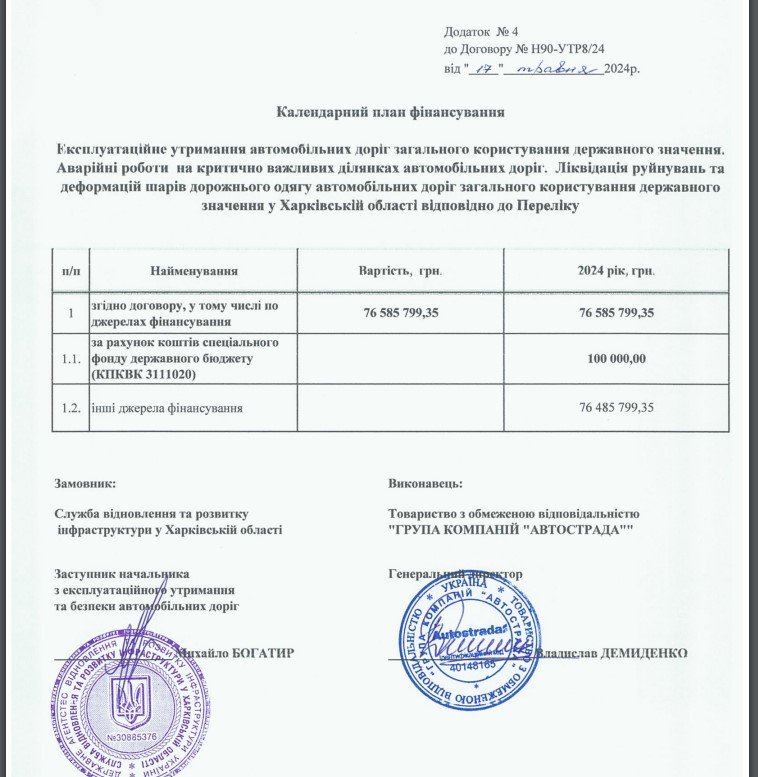 Служба відновлення та розвитку інфраструктури у Харківській області 17 травня 2024 року уклала з компанією «Автострада» угоду на ремонт доріг в