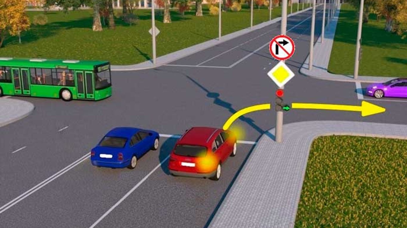 Задача по теме о регулировании дорожного движения. Разрешено ли водителю красного автомобиля повернуть направо в изображенной на рисунке ситуации?