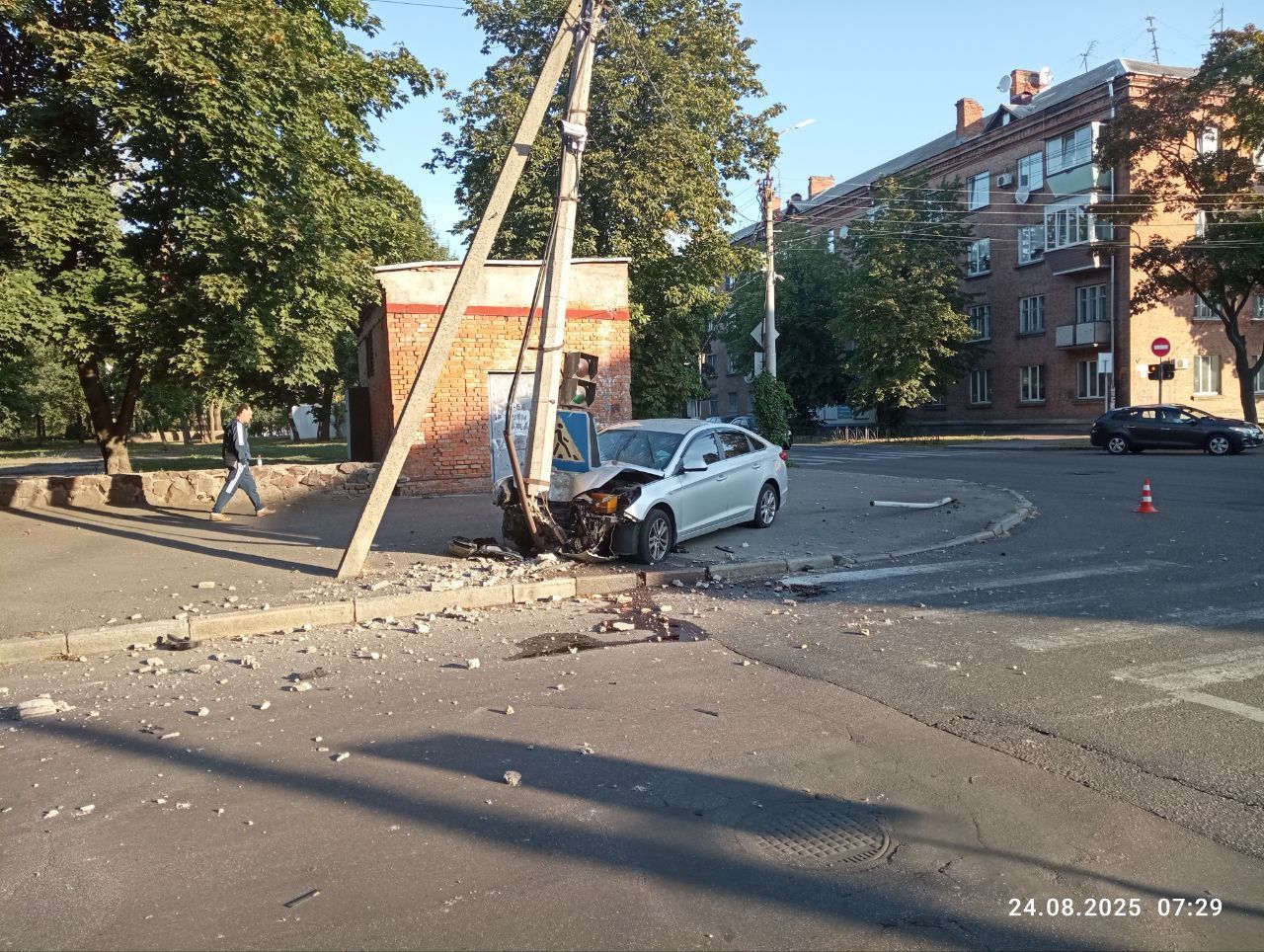 Сьогодні зранку, 24 серпня, у Черкасах на перехресті вулиць Надпільної та Небесної Сотні легковик врізався в електроопору. Через аварію рух вулицею