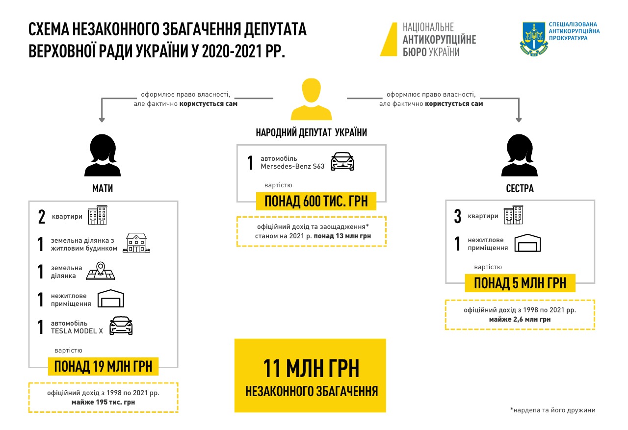 Народный депутату от партии «Слуга народа» получил подозрение в незаконном обогащении на 11 млн грн. об этом сообщили Национальное антикоррупционное