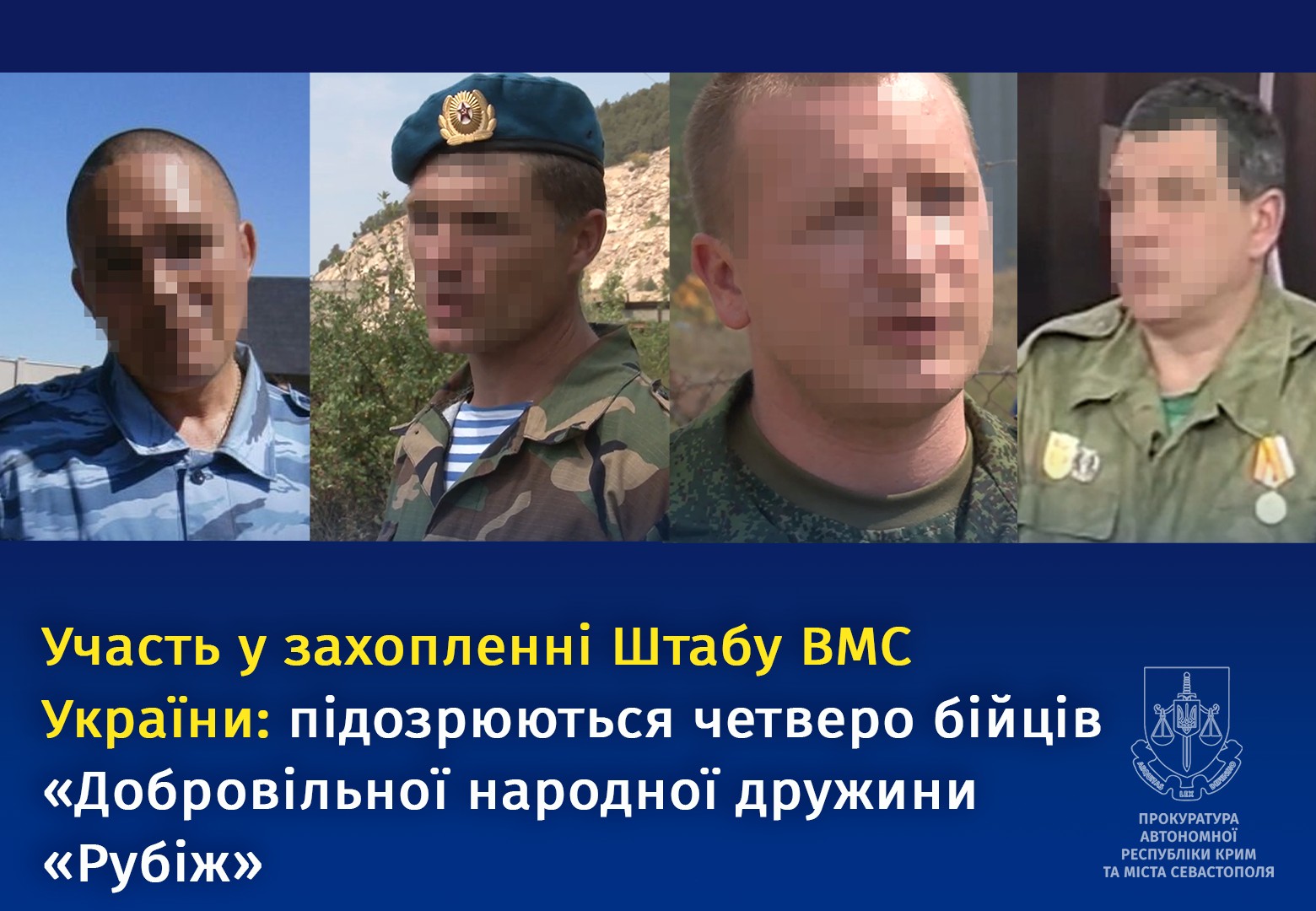 Учасникам «Добровільної народної дружини «Рубіж», які брали участь у захопленні Штабу ВМС ЗСУ у Севастополі, повідомили про підозру. Як зазначає