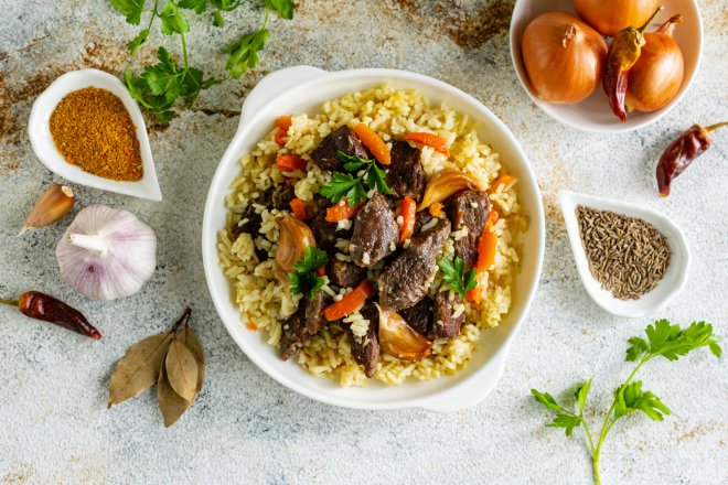 Що варто знати про рецепт плову з м’ясом у каструлі Користь цієї страви очевидна: рис дає енергію та легко засвоюється, яловичина є джерелом білка