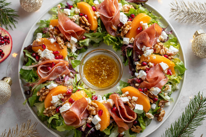 Салат-вінок із хурмою, хамоном і фетою — святковий рецепт із яскравою подачею