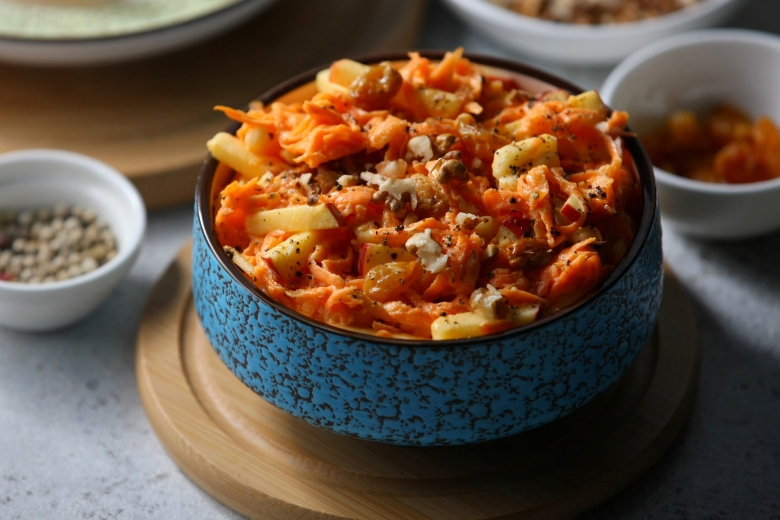 Цей салат – саме той випадок, коли прості інгредієнти працюють ідеально разом. Соковита морква, хрумке яблуко, солодкі родзинки та підсмажені