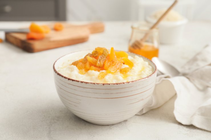 SHUBA пропонує приготувати рисову кашу на воді, проте ви можете замінити воду молоком — буде смачніше. Наріжте персики, абрикоси, манго, покладіть