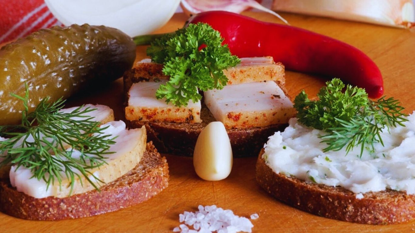 Українська козацька закуска з сала з часником та зеленню