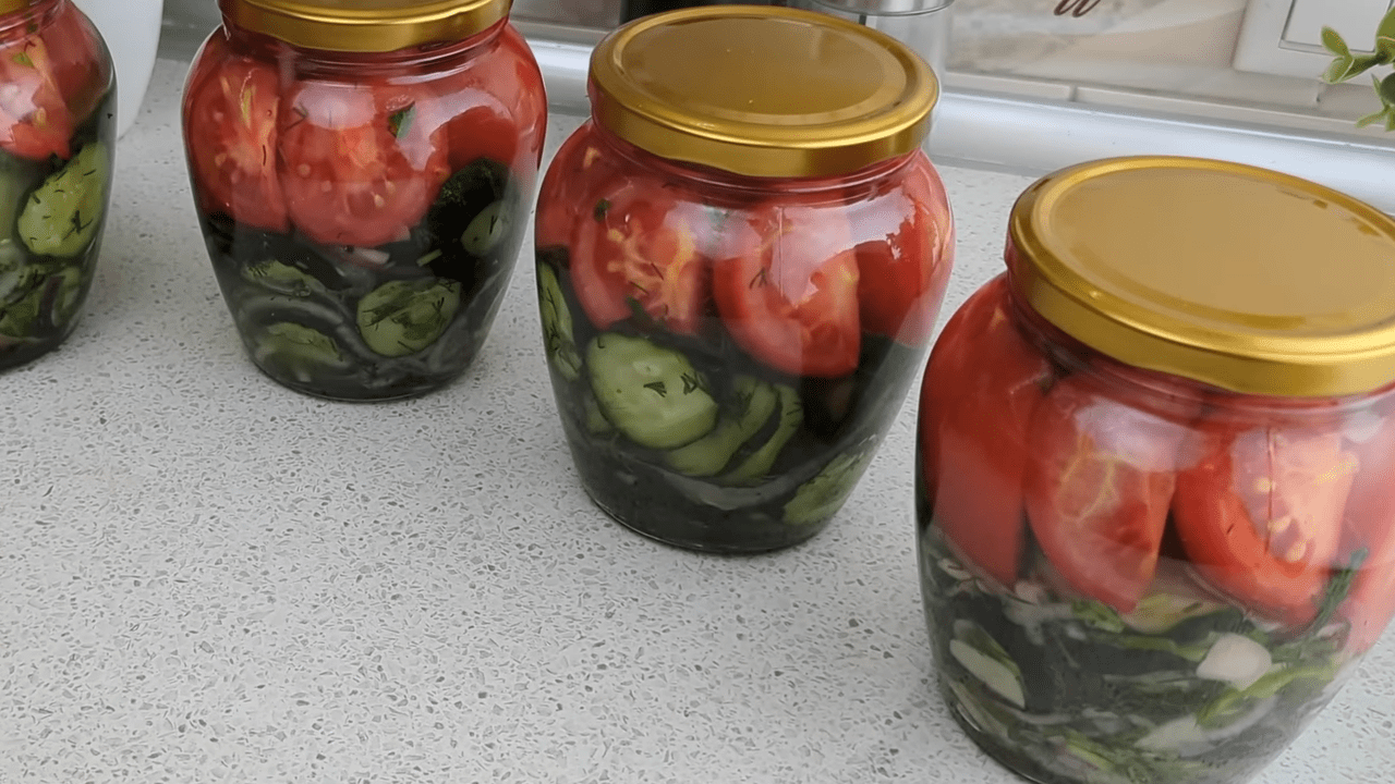 Рецепт консервації салату-асорті з помідорів, огірків та цибулі