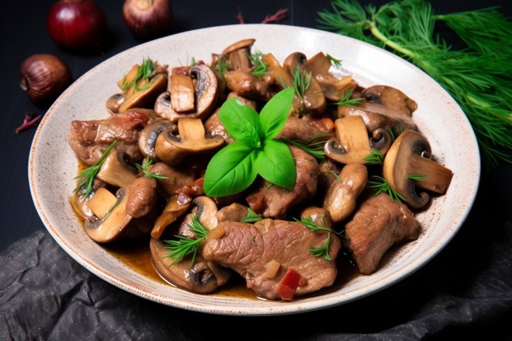 Гриби з м’ясом в сковороді — проста і поживна вечеря