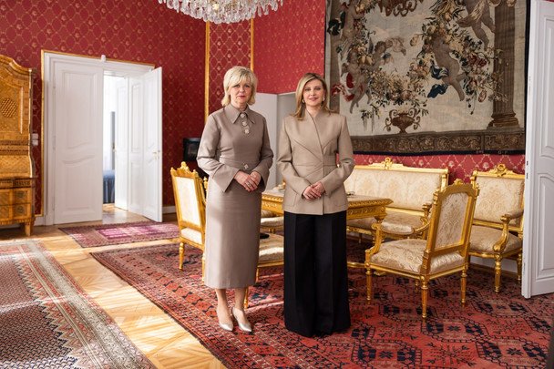 В оригінальному жакеті і штанях-палацо: Олена Зеленська у красивому образі зустрілася зі своєю чеською колегою