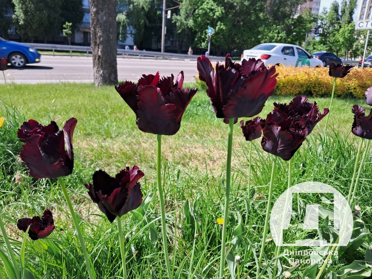 У Дніпрі на набережній розцвіли так звані чорні тюльпани. Це бархатисті квіти темно-пурпурового кольору з чорними мазками та бахромою. Особливо