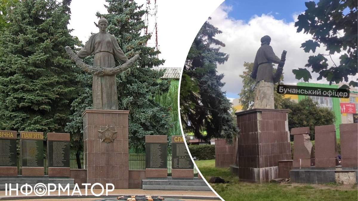 В Бучі у скорботної матері військових з радянського монументу вкрали спідницю