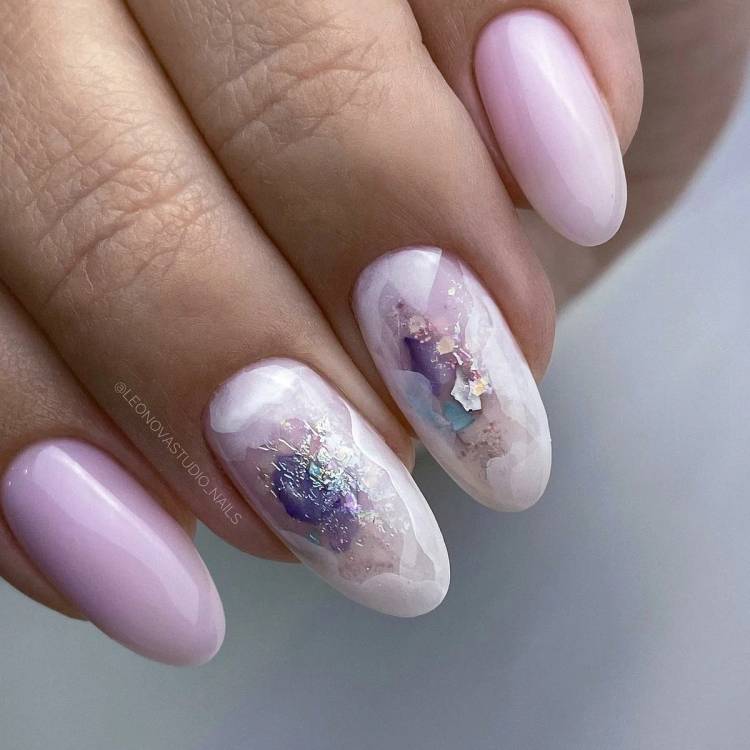 Покривають втиранням зазвичай нюдові відтінки лаку, які дуже добре підкреслюють ніжний стиль і смак модниці. Манікюр «бризки» на літо 2023