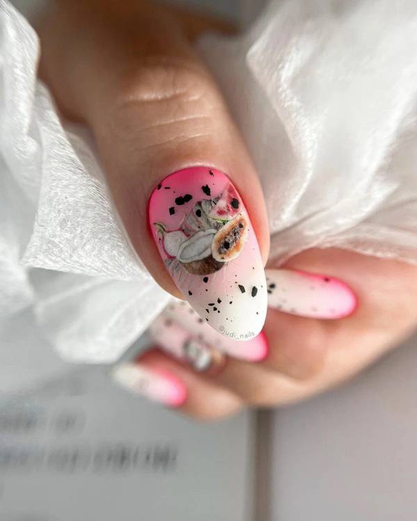 Минулого року був дуже популярний манікюр «перепелине яйце», цього року його трохи видозмінили і тепер у тренді бризки на нігтях. Вони можуть йти поруч із яскравим загальним тлом, так і доповнювати привабливий нюдовий відтінок. Анімалістичний принт в манікюрі на літо 2023 року