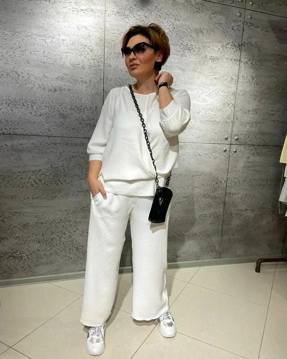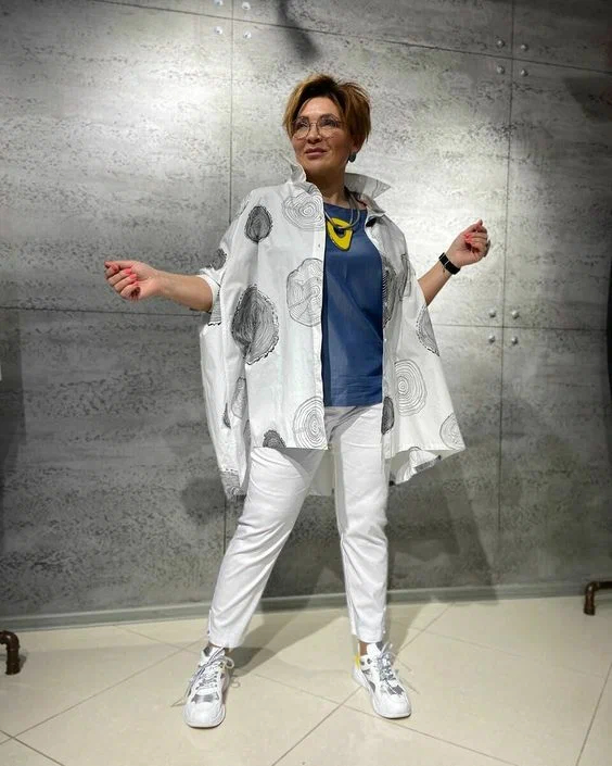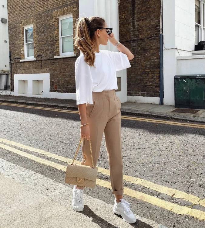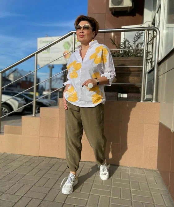 Оверсайз комфортне вбрання максі або міді довжини з пишними рукавами буфами + кросівки – ідеальне поєднання речей, яке підійде на кожен день і не тільки. Стилісти радять доповнити цей тандем речей цікавою яскравою сумочкою і тоді образ набуде завершеного вигляду. Для наступного кежуал образу стилісти використовували оверсайз штани оливкового кольору на гумці, об’ємну блузу з квітковим принтом, а також світлі громіздкі кросівки. Мінімалістичний чорний сарафан на тонких бретельках + білі громіздкі кросівки – look у класичній гамі кольорів. Найчастіше, при складанні жіночних образів стилісти для жінок зрілого віку вибирають об’ємні сорочки, подовжені кардигани, широкі штани на гумці, акцентну біжутерію, а також білого кольору кросівки або кеди.