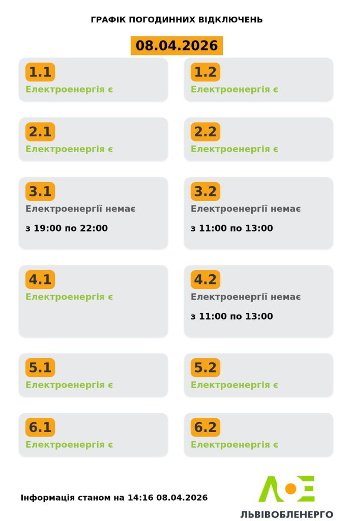 У Львівській області 8 квітня 2026 року оприлюднили оновлений графік погодинних відключень електроенергії. Згідно з інформацією, опублікованою станом