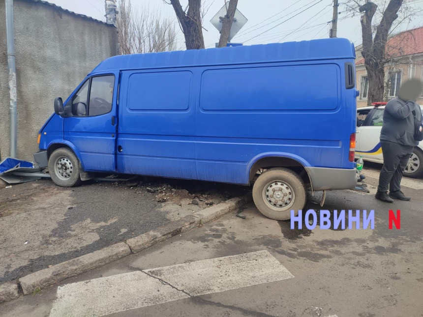 На перехресті у Миколаєві зіткнулися «Мерседес» і Ford Transit: мікроавтобус врізався в стіну будинку