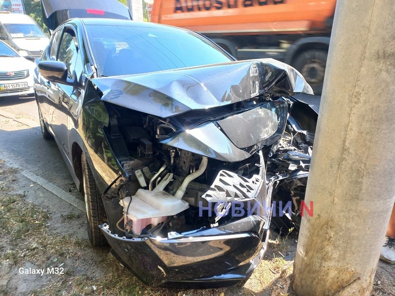 Вранці 12 липня на проспекті Героїв України в Нікоалевем після зіткнення з сідельним тягачом MAN електрокар Nissan Leaf врізався в стовп. Про це