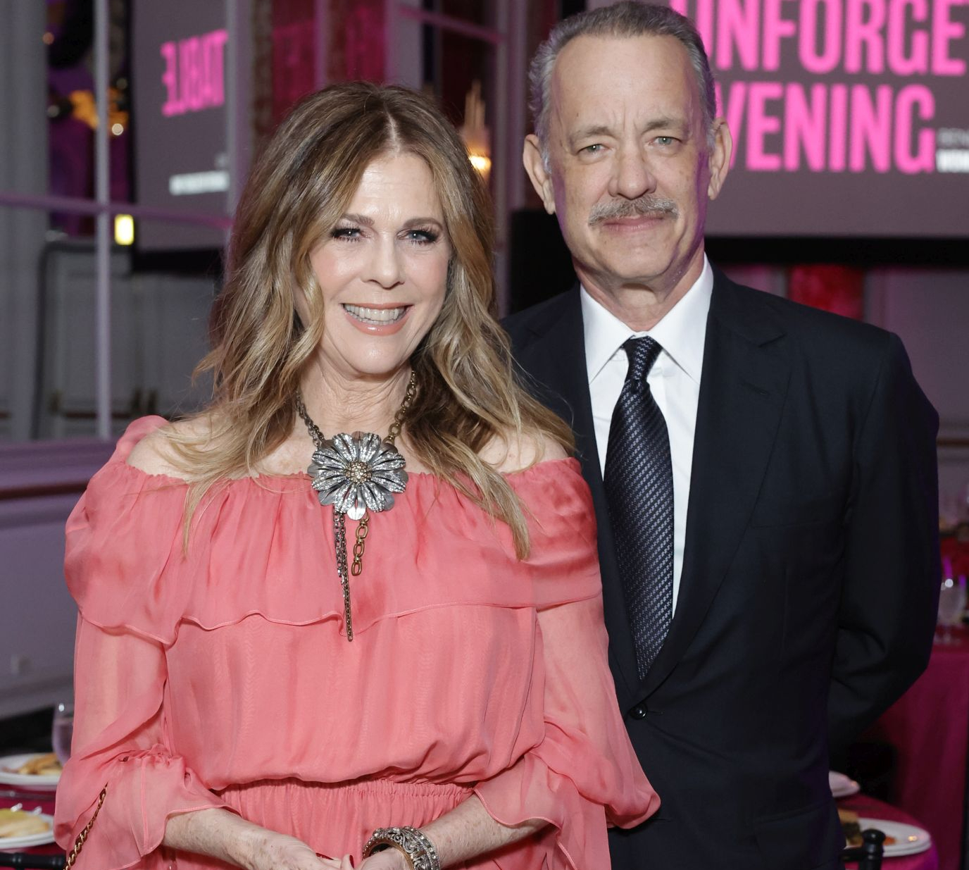 Том Хенкс у костюмі з краваткою та Ріта Вілсон з оголеними плечима попозували на благодійному івенті. Фото