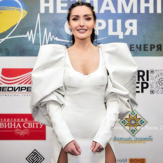 В кожаном платье с объемными рукавами и картой Украины: Анна Добрыднева выступила на благотворительном вечере