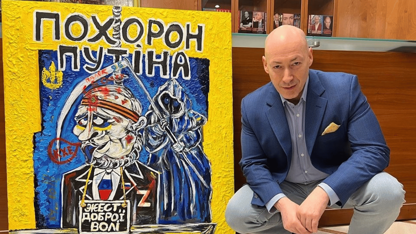 Картина "Похороны Путина" с подписями Главнокомандующего ВСУ генерала Залужного, журналиста Дмитрия Гордона, лидера группы "DZIDZIO" Михаила Хомы,