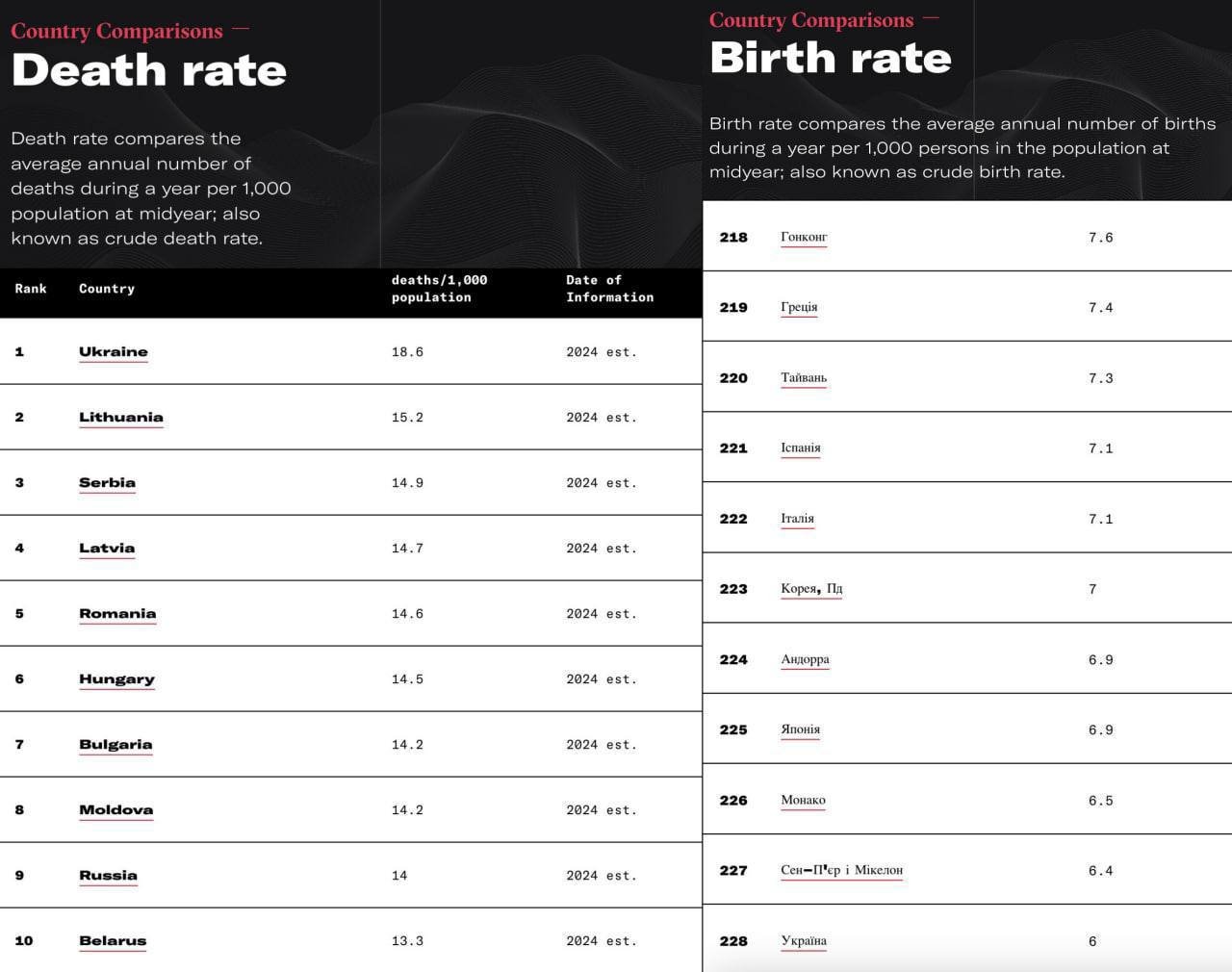 Україна стала країною з найвищим рівнем смертності у світі. Також держава посіла останнє місце за рівнем народжуваності. На це вказують останні дані