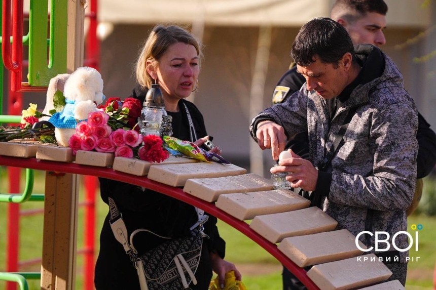 Жителі Кривого Рогу принесли на дитячий майданчик, де вчора загинули люди, дитячі іграшки та квіти. Місцеві телеграм-канали опублікували фото. Як