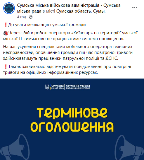 У Сумській області через проблеми з Київстаром не працюватиме повітряна тривога