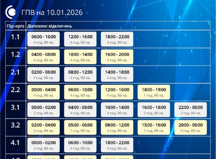 У суботу, 10 січня, на території Сумської області продовжуватимуть діяти графіки погодинних відключень електроенергії. Обмеження застосовуються