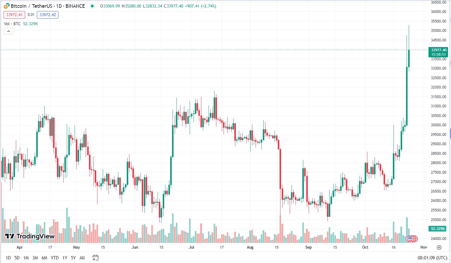 За останню добу ціна за один Bitcoin підвищилась на 11,5%. Тепер одна одиниця головної цифрової криптовалюти коштує близько 35 тисяч доларів. Це