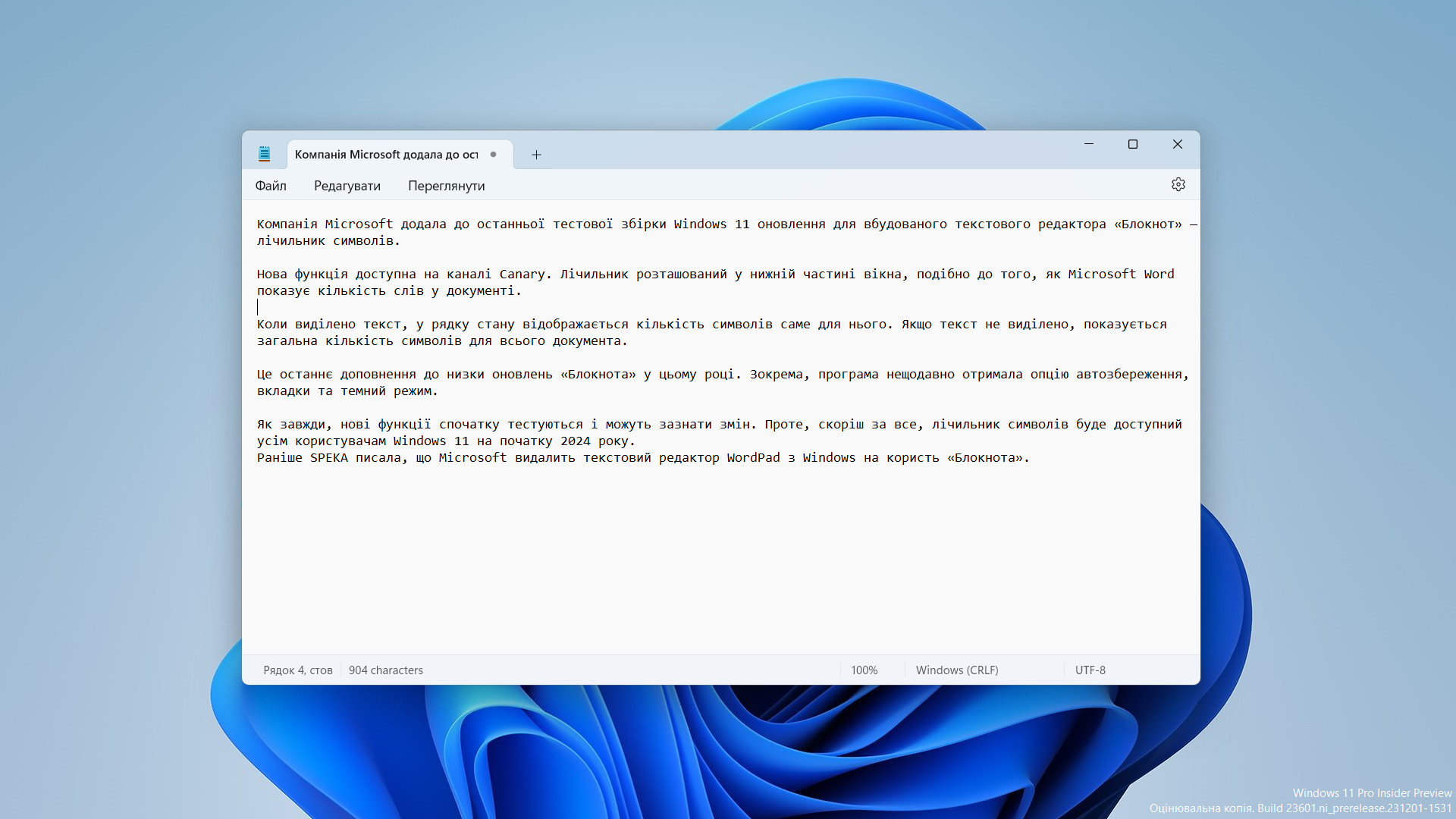 «Блокнот» у Windows 11 отримає підрахунок символів