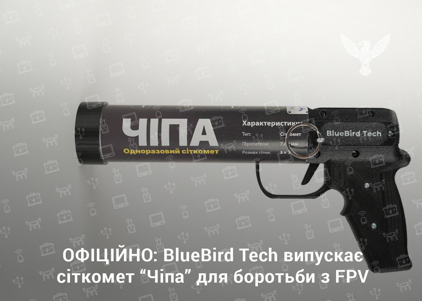Українська компанія BlueBird Tech представила новий засіб протидії дронам — сіткомет «Чіпа». Це компактна система у формі пістолета, яка перехоплює
