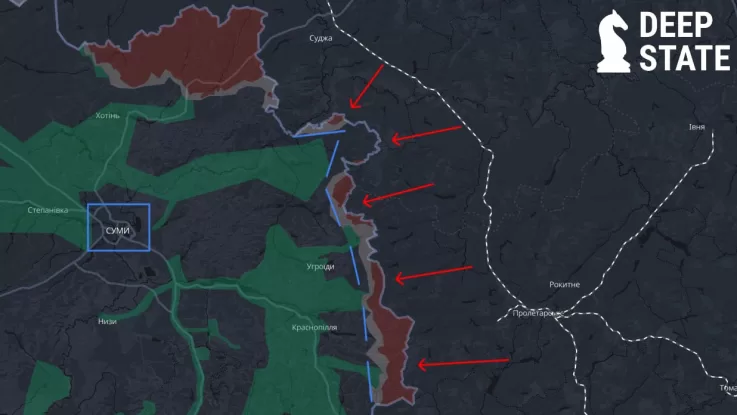 20 апр Напівоточення Сум: у DeepState розповіли, що насправді відбувається на кордоні (COMMENTS.UA) 20 апр Ворог тисне на Сумщині, але ніякої загрози для оточення Сум немає, - DeepState (Цензор.Нет) + 3 похожих 20 апр Чи є ризик оточення Сум: що кажуть військові та аналітики (КАРТА) (Texty.org.ua) 20 апр Россия давит на Сумщине, однако угрозы для города нет: DeepState прокомментировал слухи о "полуокруженных" Сумах (Dsnews) 20 апр Никакого полуокружения нет: в DeepState рассказали, что на самом деле происходит на Сумщине (УНІАН) 20 апр Аналитики опровергли фейки о “полуокружении” Сум (Головне in UA) 20 апр Формування «буферної зони»: аналітики DeepState про ситуацію на прикордонні Сумщини (Данкор online)