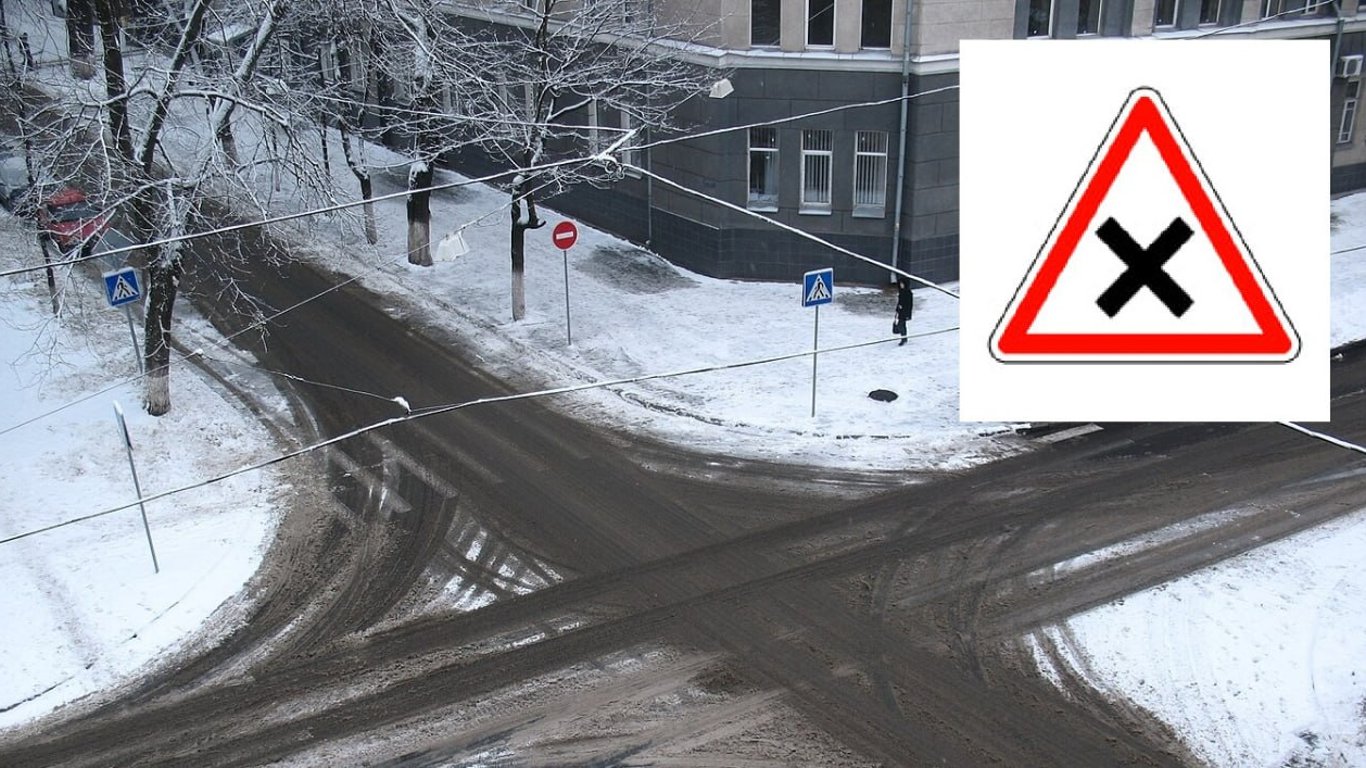 Черный крест внутри треугольника с красной каймой, символизирует перекресток. Это важный дорожный знак, который предупреждает водителей быть