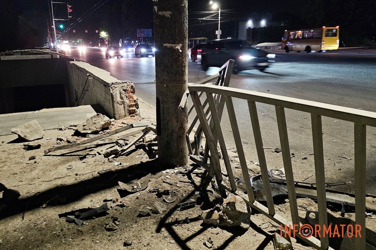 З машини вилетів двигун, постраждав водій: у Дніпрі на Запорізькому шосе Skoda врізалася у підземний перехід та огорожу