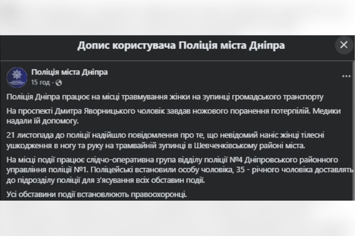 В Днепре на Дмитрия Яворницкого мужчина в "камуфляже" ударил женщину ножом: комментарий полиции