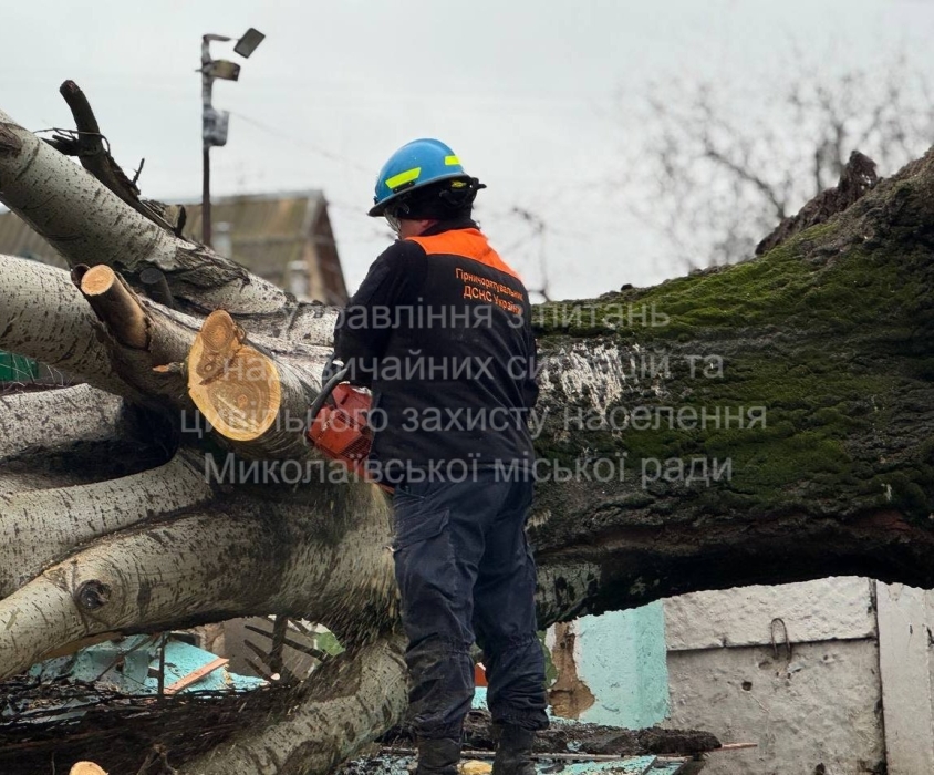 У Миколаєві тривають роботи з ліквідації наслідків негоди. До робіт залучено 10-й взвод ДВГРЗ ДСНС України. Рятувальники здійснюють розпилювання та