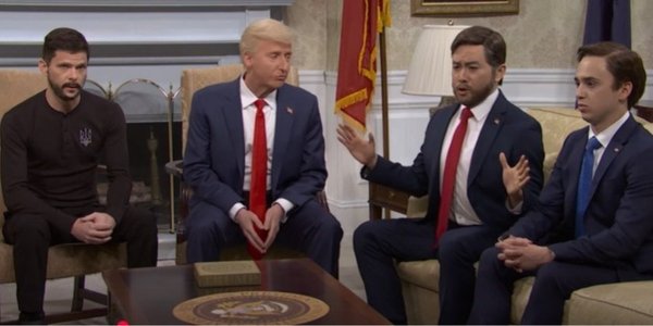 У скетчі актор Джеймс Джонсон, який грав Трампа, говорив акторові, який зображував Зеленського (Майкі Дей — мовляв, президент США «має всі козирі на