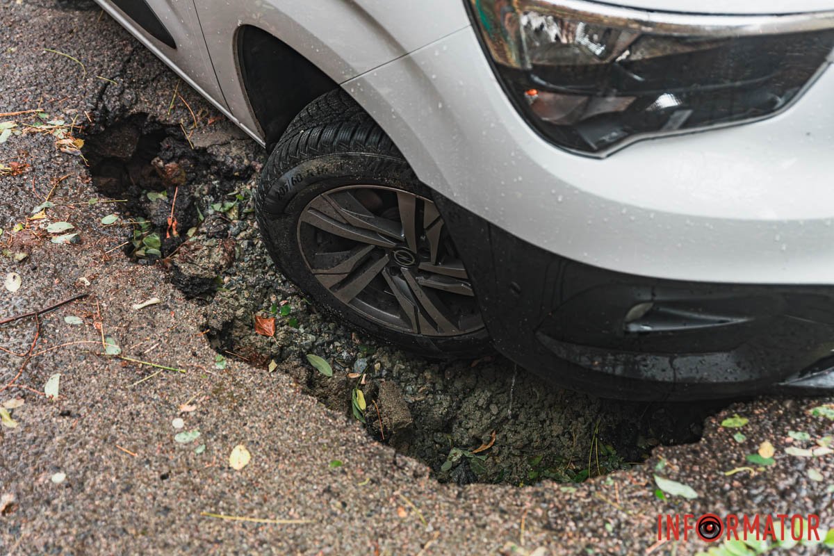 В Днепре на Акинфиева под Opel провалился асфальт: машина застряла колесом