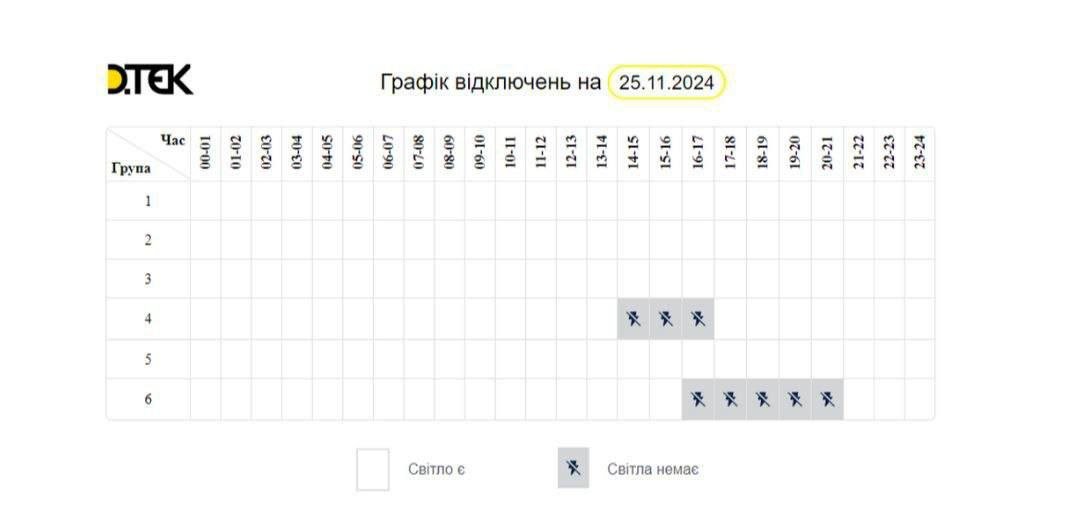 В Днепре завтра, 25 ноября, будут действовать графики отключений света. Об этом сообщили в соцсетях компании Укрэнерго. ДТЭК предоставил графики