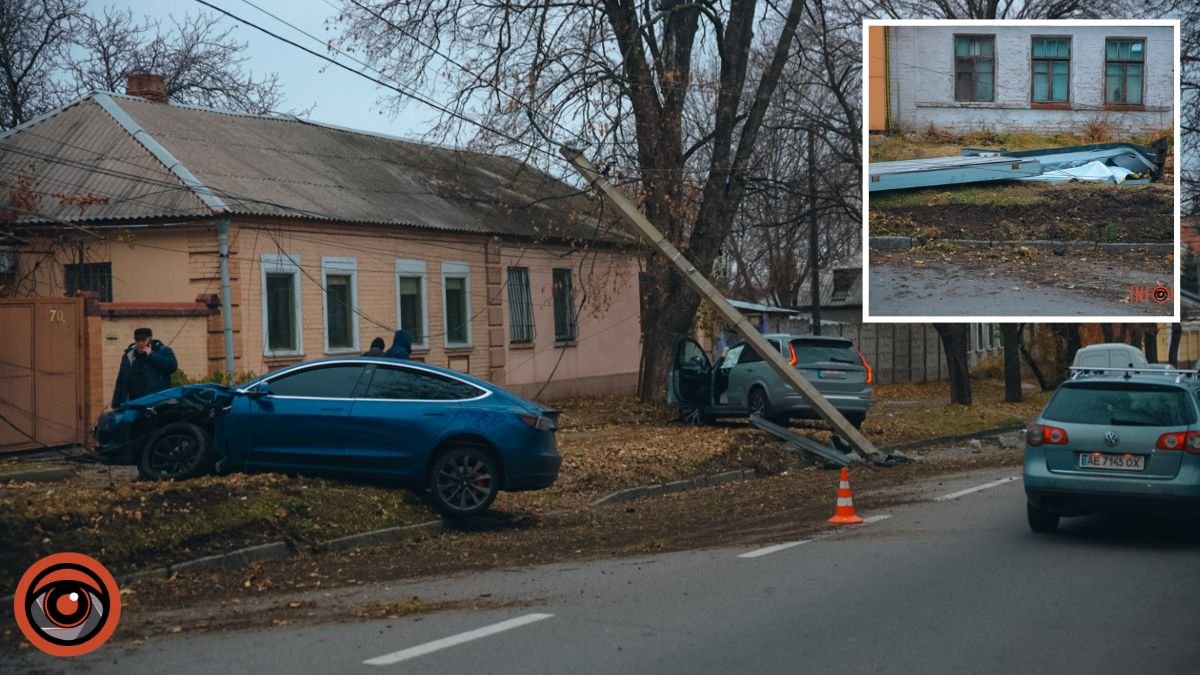 У Дніпрі на Січових Стрільців зіткнулись дві машини: Tesla знесла білборд, а Volvo - повалив стовп
