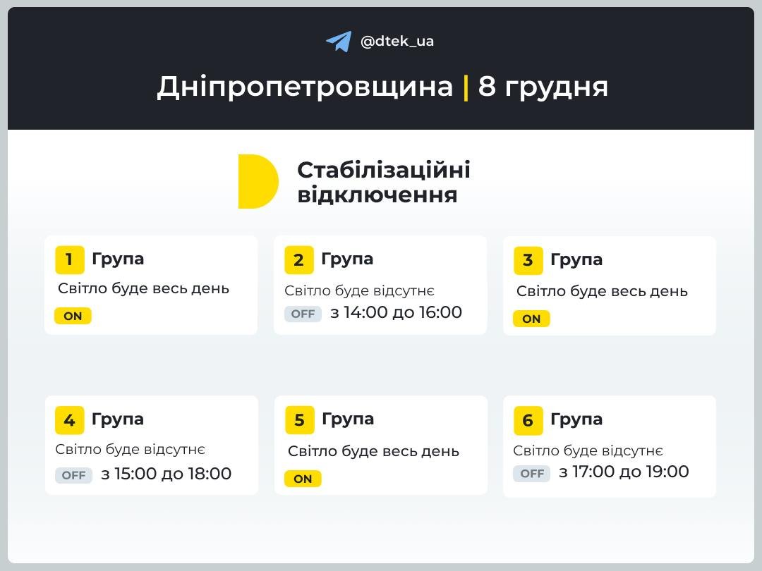 Графики отключения света в Днепре 8 декабря: ДТЭК и ЦЭК