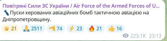 В ніч на 8 січня, у Повітряних силах ЗСУ повідомили про пуски авіаційних бомб тактичною авіацією на Дніпропетровщину. Такеповідомлення з’явилося о