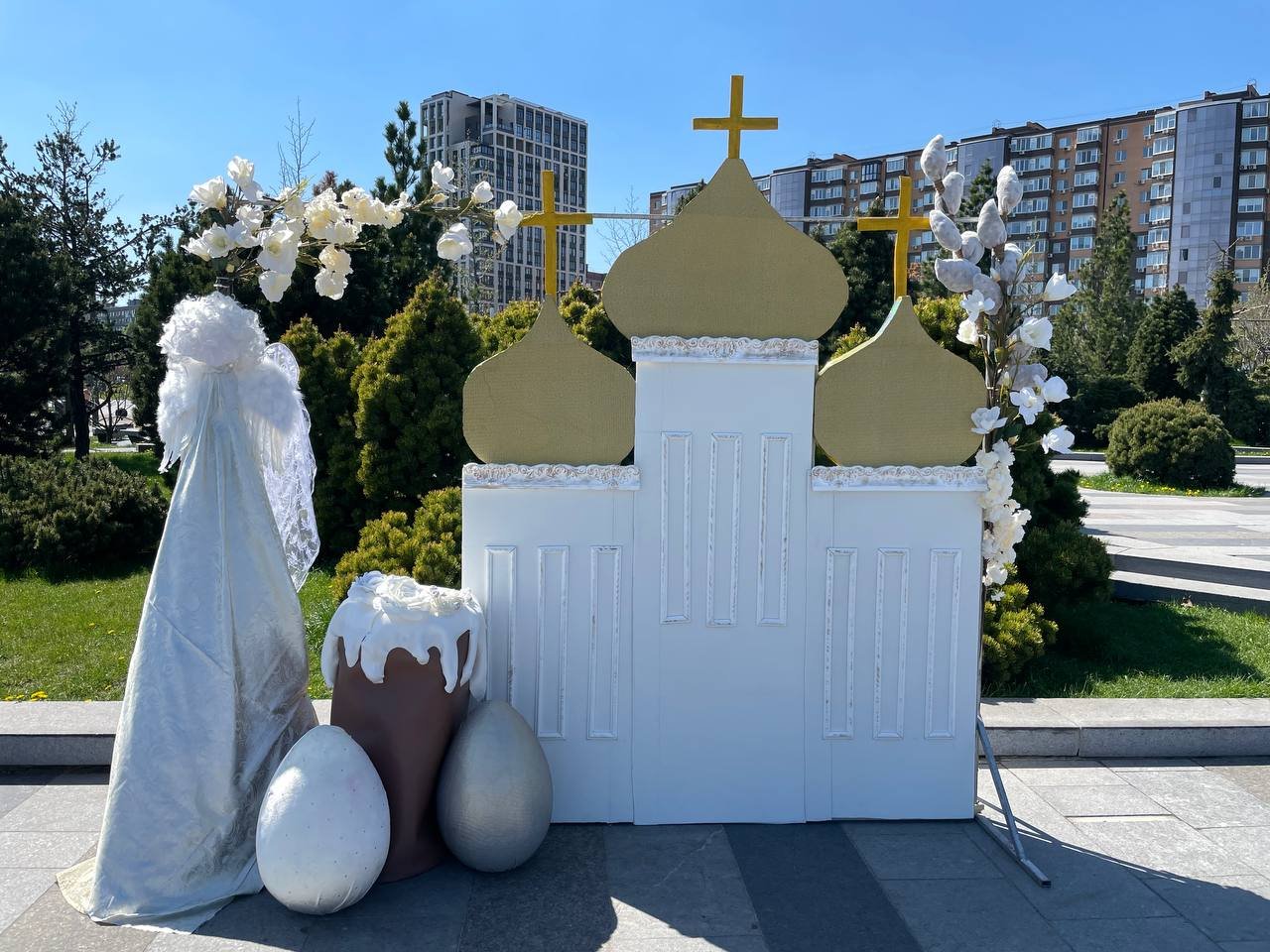 В Днепре к Пасхе появилась фотозона с гигантскими пасхальными яйцами, ангелом и картонной церковью. Расположена фотозона в Прибрежном сквере,