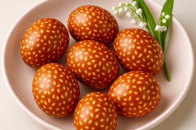 Що потрібно для фарбованих яєць з лушпинням цибулі та рису Класичний колір та дуже симпатичні білі цяточки — такими будуть ці великодні крашанки.