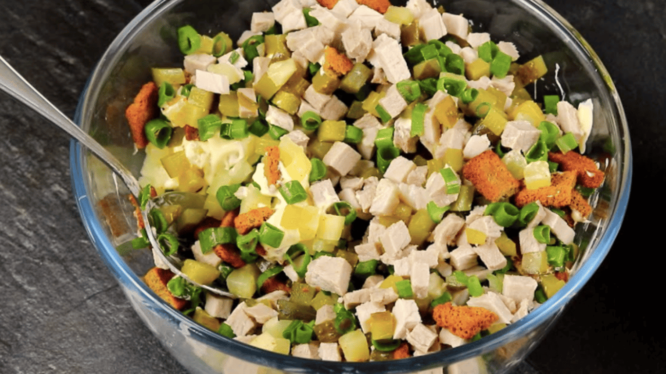 Этот салат поражает своим уникальным вкусом, сочетая нежную отварную свинину с сочными ананасами и хрустящими сухариками. Этот рецепт идеально