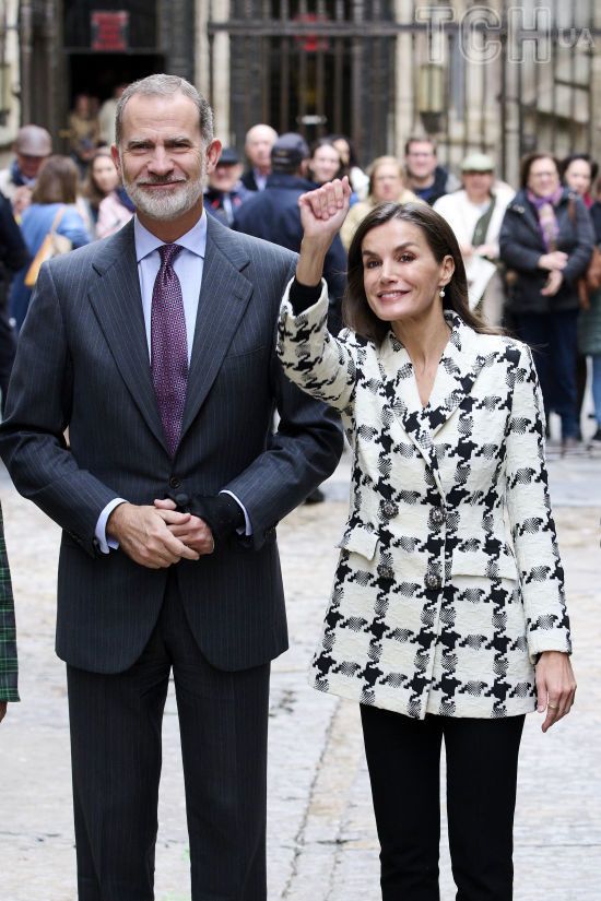 51-летняя королева Летиция появилась на публике в черно-белом образе. Ее лук состоял из удлиненного двубортного жакета в принт "гусиная лапка" от