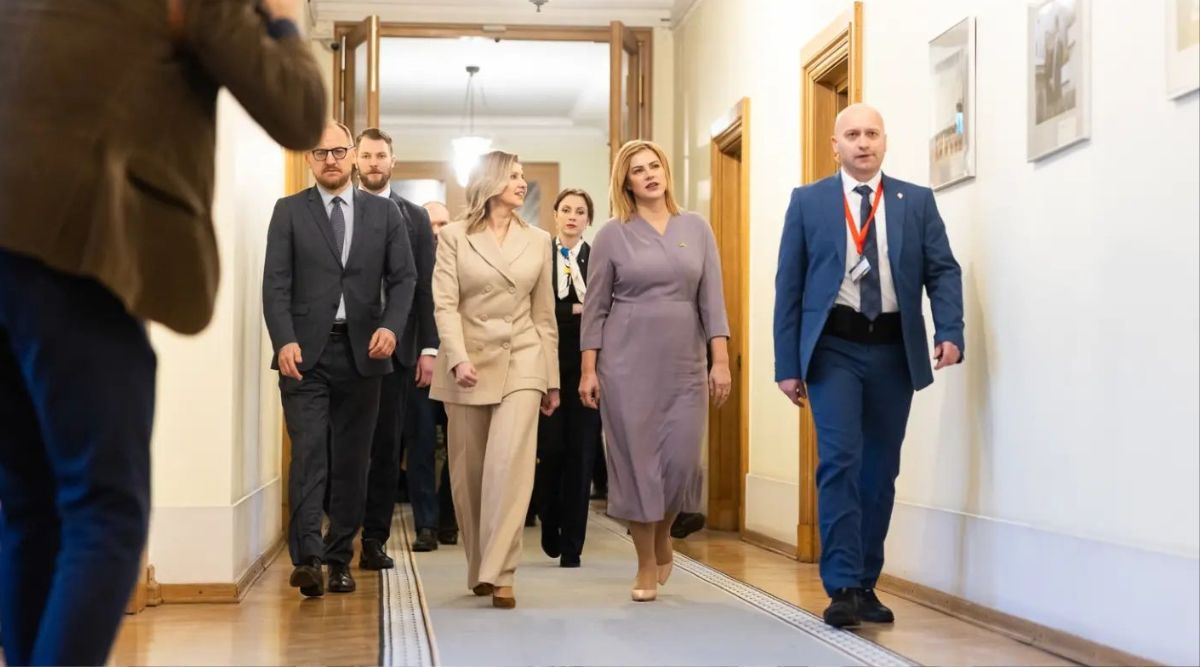 Елена Зеленская в модном песочном костюме с широкими брюками посетила Латвию: фото