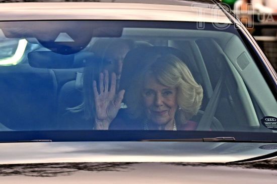 Королева Камилла ехала в автомобиле на переднем сиденье. Рассмотреть ее аутфит было невозможно, видно только, что на ней фиолетовое пальто, а на шее