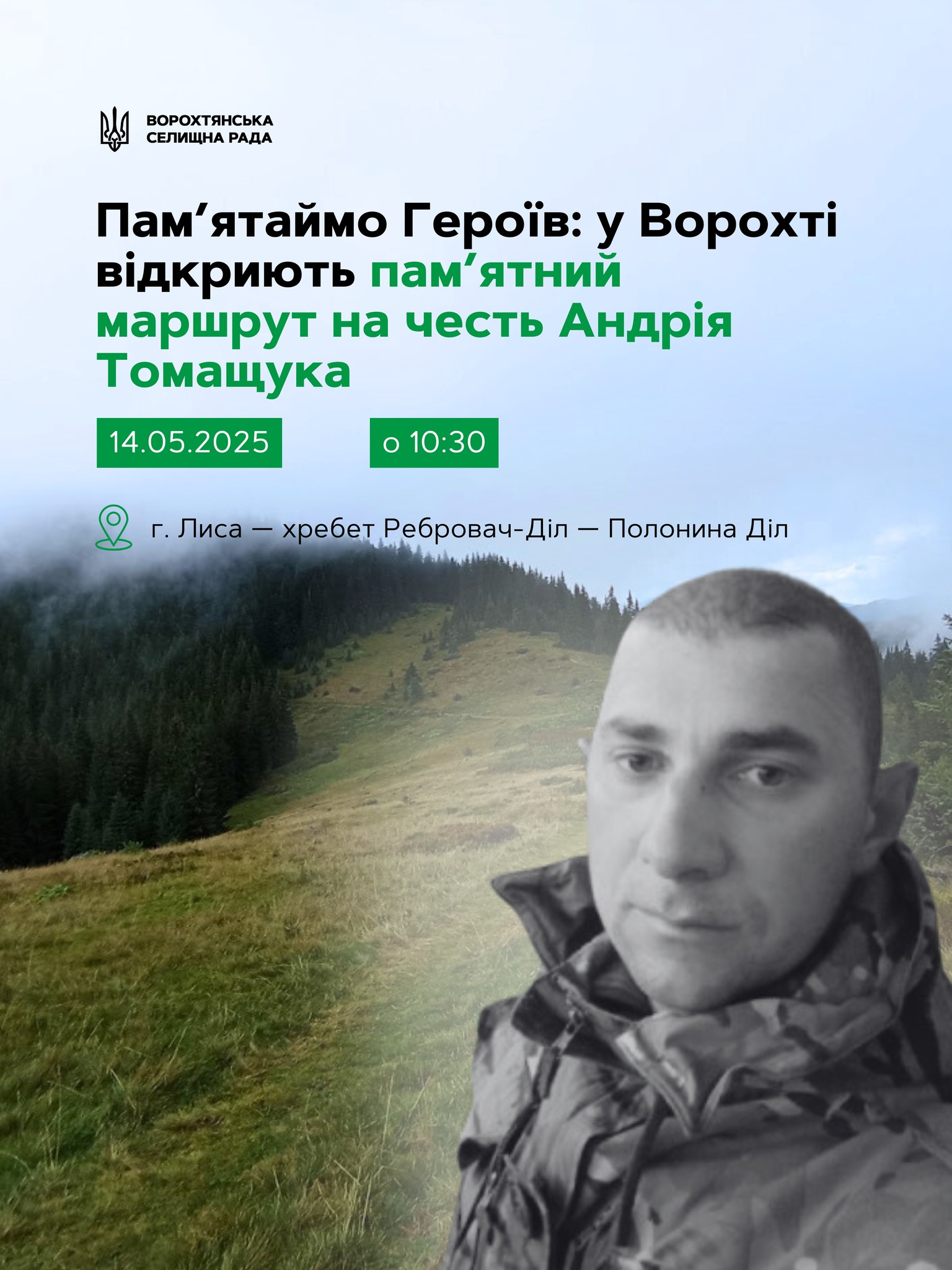 14 травня о 10:30 у селищі Ворохта відбудеться офіційне відкриття пам’ятного туристичного маршруту на честь загиблого військового Андрія Томащука.