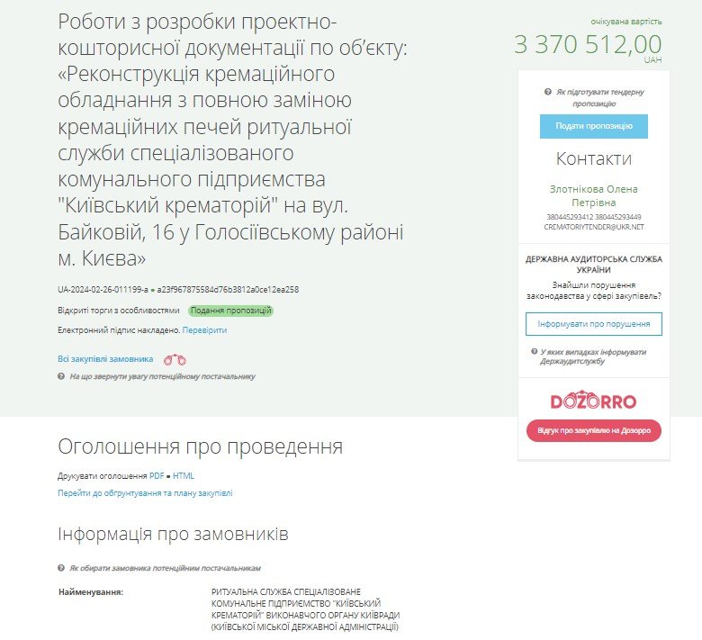 Для цього спочатку мають створити проєкт реконструкції обладнання крематорію. Тендер на такі роботи оголосили у понеділок, 26 лютого. Проєкт, який